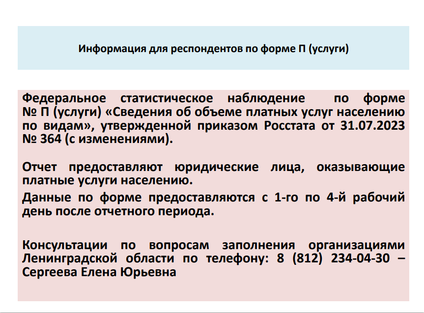 Комитет экономического развития и инвестиционной деятельности Ленинградской области напоминает о необходимости предоставления статистических отчетов по формам № П (услуги) «Сведения об объеме платных услуг населению (по видам)» и №1-услуги «Сведения об объеме платных услуг населению».