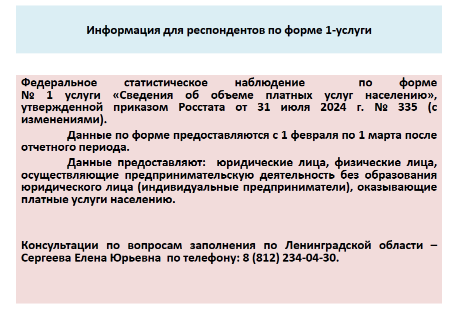 Комитет экономического развития и инвестиционной деятельности Ленинградской области напоминает о необходимости предоставления статистических отчетов по формам № П (услуги) «Сведения об объеме платных услуг населению (по видам)» и №1-услуги «Сведения об объеме платных услуг населению».